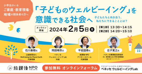 株式会社ベネッセホールディングス(本社:岡山県岡山市、代表取締役社長CEO:小林 仁、以下:ベネッセ)の「ベネッセ ウェルビーイングLab」(所長:岡田晴奈/ベネッセホールディングス 常務執行役員)は、2024年2月5日(月)、小学生の子どもと接するご家族や学校、地域の子ども支援者の方々などを対象としたオンラインフォーラムを開催いたします。