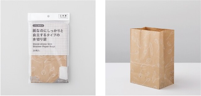 三角コーナーがいらない自立する水切り袋。耐水紙を使用しているので濡れても破れにくく、脱プラスチックで環境にもやさしい商品です。