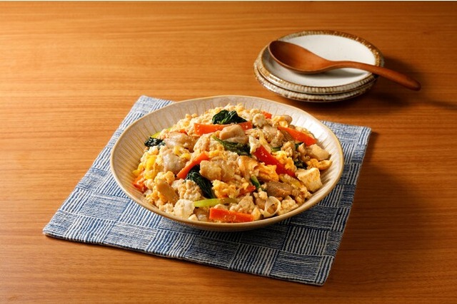 今回の第2弾は、「筋活」という言葉が幅広い世代で注目されているなか、特に中高年の意識が高くなっている背景を受け、組合員からの要望も高かった“筋肉づくり応援”をテーマにしました。良質なたんぱく質の摂取をめざし、生活クラブで人気の丹精國鶏の鶏モモ肉、木綿豆腐、卵(セット外)に、まいたけ、長ねぎ、にんじん、小松菜を合わせました。家庭で用意するものは、卵2個とごま油大さじ1のみで、添付のレシピに従い、フライパンで炒めるだけ。調理時間約10分の手軽さも魅力のセットです。なお、栄養計算は生活クラブの管理栄養士が監修しています。