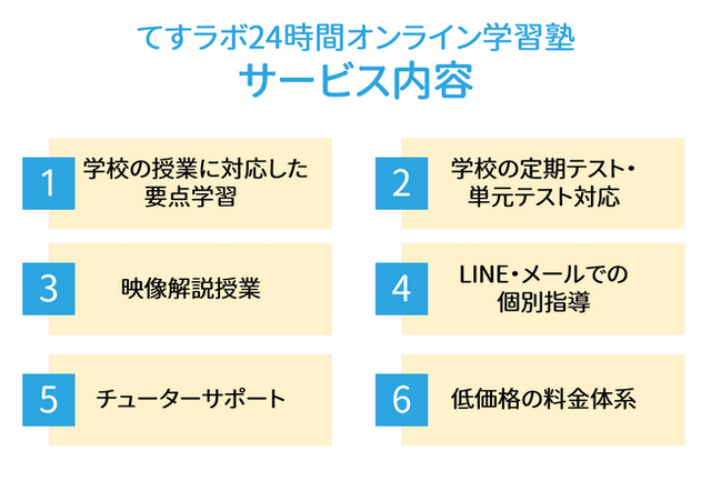 「てすラボ24時間オンライン学習塾」のサービス内容は、以下の6つのポイントで構成されています。