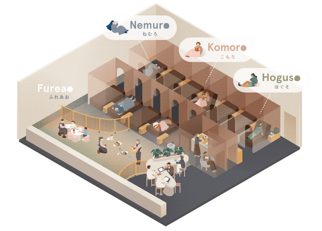 休息室は、おやすみ不足のママ・パパのために、「Nemuro」「Komoro」「Hoguso」の3種類を用意。各休息室毎にこだわりのアメニティやグッズをご用意しています。全休息室共通で、木を基調とした安らぎの空間となっており、快適な寝姿勢を導くリクライニングベッドを配置し、リラックス効果のあるBGMが流れており、ゆっくりとおやすみいただけます。
