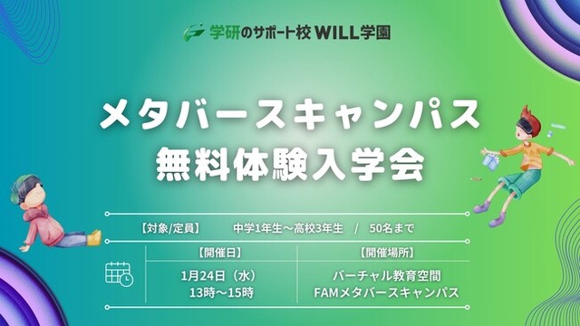 株式会社 学研ホールディングス(東京・品川/代表取締役社長:宮原博昭)のグループ会社、株式会社学研エル・スタッフィング(東京・高田馬場/代表取締役社長:伊藤弘雅)は 富士ソフト株式会社が開発をしたFAMcampus上で展開する学研WILL学園メタバースキャンパスにて2024年1月24日(水)に「無料体験入学会」を開催予定です。
