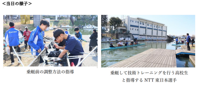 この教室は県内漕艇部所属の高校生と、プラチナジュニア※1のローイング競技認定者の中学生の総勢50名が、一流選手による指導を体験できる貴重な場として開催され、NTT東日本からは、日本有数の実力を持つNTT東日本漕艇部選手が指導を行いました。