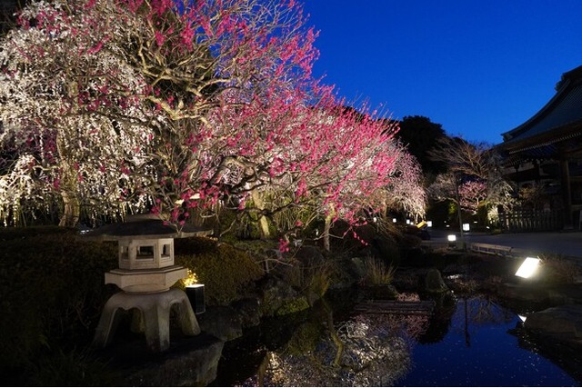 早咲きの冬至梅が開花し始めた境内は、薄紅色や白色の梅の花が徐々に咲き繋いでいくため、訪れるたびに様々な角度から観梅をお楽しみいただけます。山門奥の枝垂れ梅が見頃を迎えますと優雅な美しさに思わず立ち止まりしばし見とれてしまいます。またライトアップされた梅の枝ぶりや花は、幻想的で日中とは異なる魅力を放ちます。