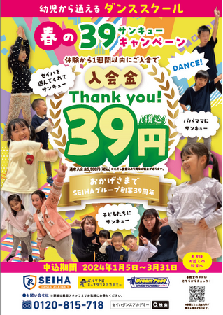 【セイハダンスアカデミー】では、2024年1月5日~3月31日まで、ご入会いただくお客様に感謝の気持ちを込めて「春の39キャンペーン」を実施しております。