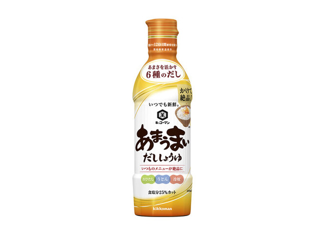 「いつでも新鮮(R) あまうまいだししょうゆ」は、“あまみとうまみ”が特徴のだししょうゆです。国産だし原料100%にこだわり、いわし・むろあじ・宗田鰹・鰹・煮干・昆布の6 種のだしをブレンドしました。3 種類のしょうゆにこだわりのだしや砂糖などを合わせ、“あまうまい”味に仕上げました。