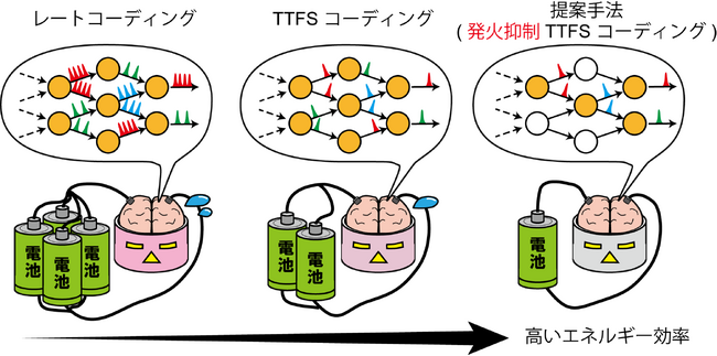 SNNの専用ハードウェアにおいては、主としてスパイクの生成(発火)によって電力が消費されるために、少ないスパイク数(発火頻度)によって情報処理を行うことが重要です。これを実現するものとして、スパイクの時間情報を活用したテンポラルコーディングによる学習アルゴリズムが開発されてきました。その中でも、Time-to-First-Spike Coding (TTFS)と呼ばれるコーディングは、1ニューロンあたり、最大1回までしか発火しないという制約を課すことで、高い学習性能と高いエネルギー効率を両立できることが知られています。しかし、この制約を越えて発火が抑制可能かどうかは、ほとんど調べられていませんでした。