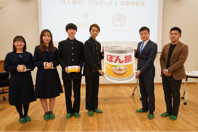 長田高校とミツカンは、2023年8月より約半年間、「ぽん鍋缶」のアイデアの具現化にともに取り組んでまいりました。「ぽん鍋缶」は、コンロや家電のない校内などの環境でも、温かい鍋をいつでもどこでも簡単に食べることができるもので、2022年9月~2023年3月に開催された、「マイナビキャリア甲子園2022年度大会」にて、長田学校の学生で構成されたチーム「ながったらー」が、味ぽんブランドをきっかけに考案したアイデアです。