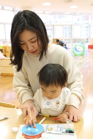 令和6年1月18日(木曜日)、高槻市立子育て総合支援センター「カンガルーの森」で食品の廃容器と割りばしを使った「鬼のでんでん太鼓」作りが行われ、参加した約30組の親子がひと足早い節分気分を楽しみました。