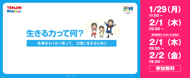 幼児・小学生・中学生を対象としたデジタル学習教材「天神」を企画・開発・販売する株式会社タオ(本社:滋賀県草津市、代表取締役:黒澤 慶昭)は、1月29日(月)の11:00、及び2月1日(木)19:30から「生きる力って何?~未来をわくわく笑って、力強く生きるために~」と題してユーザー向けウェビナーを開催します。「天神」ユーザーは誰でも無料で参加でき、後日アーカイブも配信します。