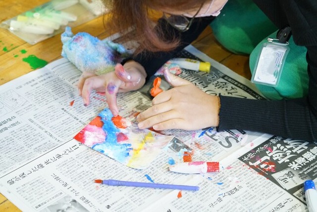 後半では、ポストカードに自分自身の感情をアートとして表現。講師の間宮氏から「筆を使わなくてもいい、指や手のひらも使っていいよ!」、「周りのお友達は気にせず自分が好きなように書いてみてください。」と聞き、十人十色、喜怒哀楽、自分の感情を表現することにチャレンジ。