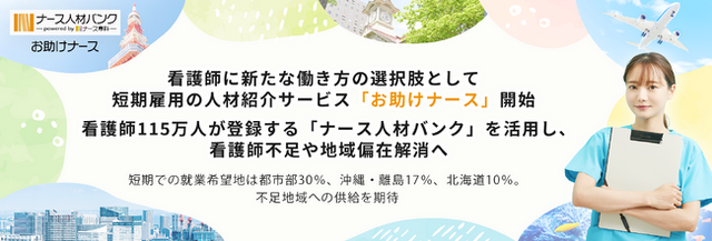 株式会社エス・エム・エス(本社:東京都港区、代表取締役社長:後藤夏樹、東証プライム、以下「当社」)は、提供する看護師・助産師・保健師向け人材紹介「ナース人材バンク」(URL:https://www.nursejinzaibank.com/)にて短期雇用の人材紹介サービス「お助けナース」(URL:https://www.nursejinzaibank.com/special/otasukenurse/)を開始することをお知らせします。
