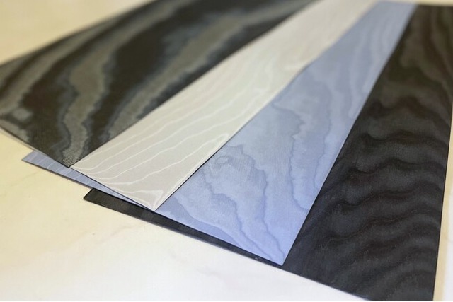 NUNOUSとは廃棄されてしまう布を原料に当社独自の特許製法で数百枚積層し、サトウキビ由来の樹脂を含侵・圧着してブロック状にしたもので、水平方向にスライスしたシート状のものを「SKIN」とネーミングし、建築・高級インテリア資材として販売されています。原料が布でありながら、革や木のような手触りで加工がしやすいという特徴があり、1枚として同じ柄がなく、全てが1点物という岡山発のユニークな素材です。