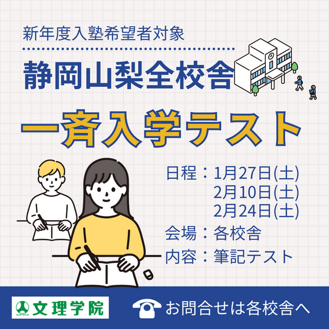 文理学院では、「全校舎一斉入学テスト」を実施いたします。対象は、入塾を希望する小学生・中学生となります。この入学テストは全3回が予定されています。第1回は1月27日(土)、第2回は2月10日(土)、第3回は2月24日(土)です。