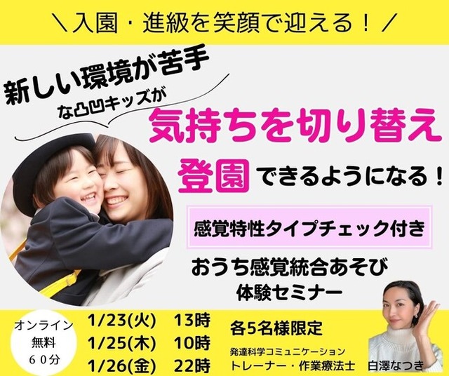 この度、『╲入園進級を笑顔で迎える/新しい環境苦手な凸凹キッズが、気持ちを切り替え登園できるようになる。感覚特性タイプチェック付きおうち感覚統合あそび体験セミナー』を開催いたします。