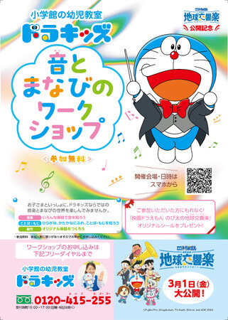 3月1日公開『映画ドラえもん のび太の地球交響楽(ちきゅうシンフォニー)』は、“音楽”をテーマにしたドラえもんたちの冒険物語です。「ドラキッズ 音とまなびのワークショップ」も“音楽”をテーマにした幼児教室ならではのイベントになります。心地よい音楽と楽しいリズムに触れながら「音」の面白さを体感したり、乳幼児のお子さまが興味を持ち始めた「ことば・もじ」を用いて「まなび」を体験したり、オリジナル楽器を製作して、音楽に合わせて楽しく皆で合奏します。