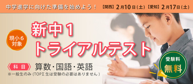 京都・滋賀・愛知を中心に学習塾を展開する京進は、2024年2月に現小学6年生を対象に「新中1トライアルテスト」を実施します。このテストは、京進に通塾していない一般生に向けた公開テストで、関西エリアでは2月10日(土)、愛知エリアでは2月17日(土)に「京進の中学・高校受験TOPΣ」各校で行います。料金は無料です。