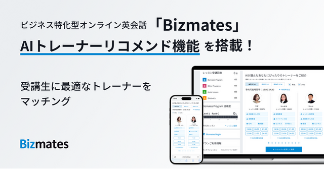ビジネス特化型オンライン英会話事業「Bizmates」(以下「Bizmates」と言う。)(https://www.bizmates.jp/)を展開するビズメイツ株式会社(本社:東京都千代田区、代表取締役社長:鈴木 伸明 、以下「当社」と言う。)は、2024年1月16日に講師(以下「トレーナー」と言う。)の予約時にAIを活用したトレーナー提案を行う機能を追加しました。これにより、受講者とトレーナーとのより良いマッチングが可能となります。