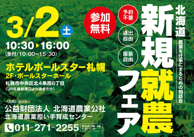 フェアチラシPDF444KB(https://www.pref.hokkaido.lg.jp/fs/9/6/4/1/7/3/0/_/02%20%E6%96%B0%E8%A6%8F%E5%B0%B1%E8%BE%B2%E3%83%95%E3%82%A7%E3%82%A2%20%E3%83%81%E3%83%A9%E3%82%B7.pdf)