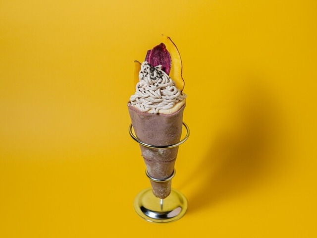 焼芋アイスブリュレクレープに、マロンクリームをトッピング。マロンの甘さとカスタードクリームの相性が抜群な一品。さらにクリームの上に、芋チップスをトッピングした【さつまいも博限定スイーツ】