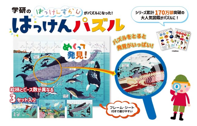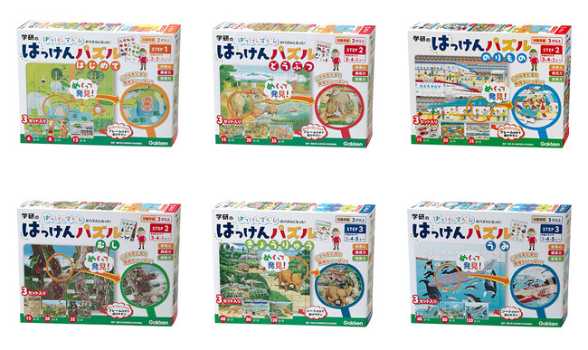 「はっけんパズル」は、シリーズ累計170万部突破、めくるしかけが大人気の『はっけんずかん』(Gakken発刊)とコラボしたジグソーパズルです。パズルをはずすと絵が変化し、ワクワクする発見がいっぱいの内容が出てきます。「なぜ?ふしぎ!もっと知りたい!」という好奇心がお子さまの興味の幅を広げ、遊びながら感性を刺激する知育パズルです。