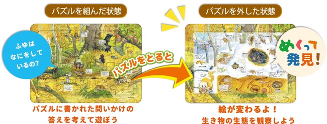 めくると変わる絵を楽しみながら、いろいろなひみつを発見できる『はっけんずかん』の特徴をパズルに落とし込んだ、ピースをはずすと絵が変化する、楽しいパズルです。