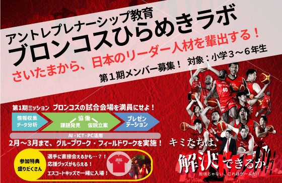 埼玉県、さいたま市から日本のリーダーを育てたい!!という熱い想いから生まれた教育カリキュラムです。実際のさいたまブロンコスで抱えている課題を情報収集しながら見つけ出し、仲間と話し合い、実際の現場に足を運び、解決策を提案する。AI×ICT×PCスキルも駆使しながら、ゲーム感覚で誰でも楽しみながら学べる探究型のカリキュラムです。第1回~第5回のイベント型となっており、1回目には、さいたまブロンコス選手も登場!!2回目には実際の試合会場へ足を運び、現場の裏側見学やスタッフへのインタビューなどを実施。最終回は試合会場でのプレゼン動画を配信し多くの方に知ってもらえるような取り組みとなっています。