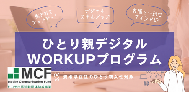 デジタルスキルアップを通してライフスタイルに合わせた積極的なキャリア形成を支援する一般社団法人愛媛デジタル女子プロジェクト(所在地:愛媛県松山市、代表:飯野めぐみ)は、『ドコモ市民活動団体助成事業』の採択を受け、愛媛県在住のシングルマザー向けデジタルスキルアップ支援プログラム「ひとり親デジタルWORKUPプログラム」の参加募集を開始しました。
