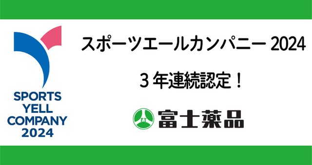 富士薬品は「とどけ、元気。つづけ、元気。」のスローガンのもと、人々の元気な毎日を支え続けることを使命に事業活動を展開しています。そして、そのためには従業員の健康が不可欠と考え、健康経営の取り組みに力を入れています。この度、健康経営の一環で行っている運動を促進する取り組みが評価され、2022年・2023年に続き「スポーツエールカンパニー 2024」の認定を受けました。