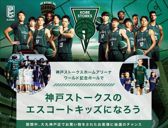 実施内容 :神戸ストークス試合会場で配布されるチラシまたは WEB ページの告知画面を持参のうえ、期間中、大丸神戸店で税込 5,000円以上(レシート合算可)お買上げの方に、抽選で3月17日(日)のワールド記念ホール試合でのエスコートキッズ参加の権利をプレゼント