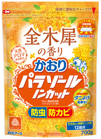 そこで、『かおりパラゾールノンカット』にユーザーニーズに応える『同 700g 金木犀の香り』を数量限定で発売いたします。ふわっと甘い香りが収納空間に広がる「防虫」「防カビ」「収納空間のダニよけ効果※」が付いた多機能タイプです。※屋内塵性ダニに対する効果
