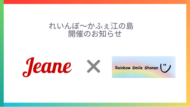 株式会社ジーン(本社:東京、代表取締役社長:林田洋明、以下当社)は、湘南人不動産 湘南支店において、業務提携を開始した レインボースマイル湘南(代表:鈴木理恵)と共同で、「れいんぼ~かふぇ江の島」を開催いたします。