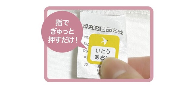 衣類のタグにぎゅっと貼り付けるだけで、お洗濯可能なお名前シール。※粘着を定着させるために24時間置いてからのお洗濯を推奨しています。