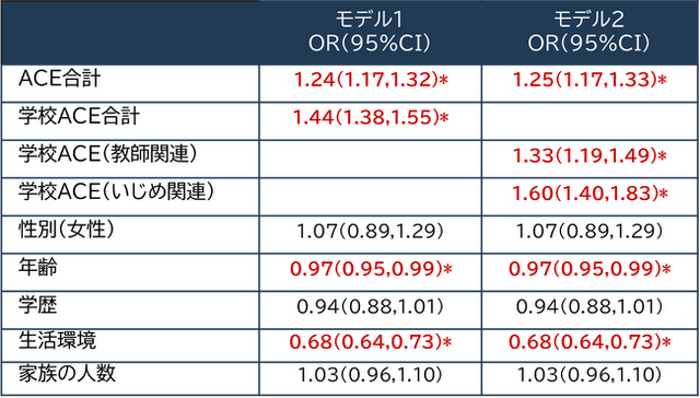 ACE、学校ACEともに成人期の抑うつ/不安に関連があった。
