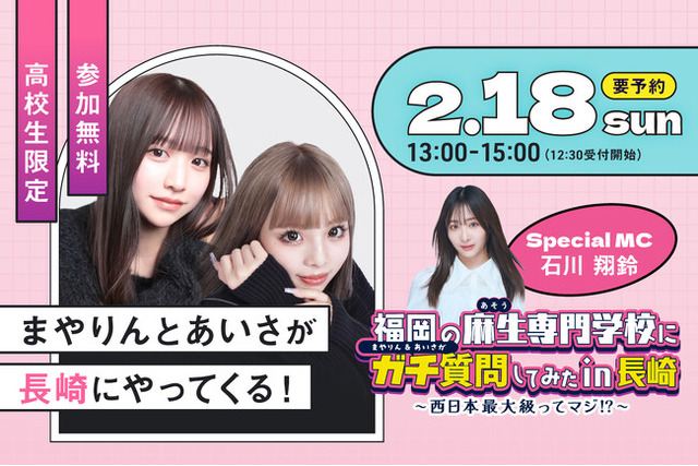 2月18日(日)に西日本最大級の専門学校グループ 学校法人麻生塾/麻生専門学校グループ(理事長:麻生 健)が、長崎県勤労福祉会館(長崎市)に重川 茉弥(まやりん)さんと、あいさ(細川 愛沙)さん、スペシャルMCに石川翔鈴さんお迎えし、高校1・2年生限定の無料イベント(要予約)を開催します。