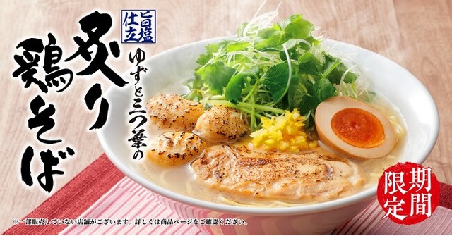 春期間限定の「旨塩仕立 ゆずと三つ葉の炙り鶏そば」について