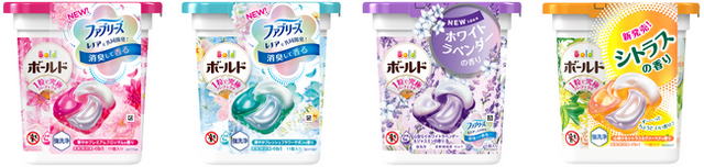 左から、「ボールド ジェルボール4D 華やかプレミアムブロッサムの香り」、「ボールド ジェルボール4D 爽やかフレッシュフラワーサボンの香り」、「ボールド ジェルボール4D ホワイトラベンダーの香り」、「ボールド ジェルボール4D 心弾けるシトラス&ヴァーベナの香り」