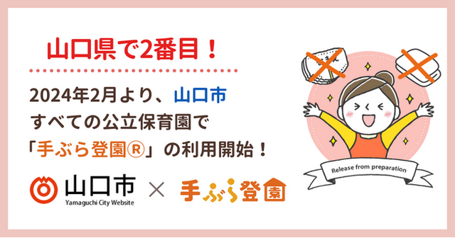 BABY JOB株式会社(本社:大阪府大阪市、代表取締役社長 上野公嗣)は、2024年2月より山口県山口市の市立保育園全13園において、保育施設向け紙おむつとおしりふきのサブスク「手ぶら登園」が利用されることをお知らせします。山口県の公立保育施設では、下関市につづいて2番目の導入となります。