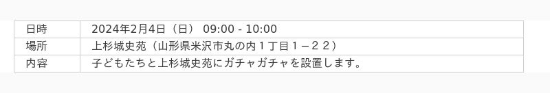 このたび、山形県米沢市の上杉城史苑(運営:株式会社上杉コーポレーション 代表取締役:遠藤勲)と、山形県山形市のやまがたクリエイティブシティセンターQ1(運営:株式会社Q1 代表取締役:馬場正尊)の協力のもと、上杉城史苑・Q1内に子どもたちが企画したガチャガチャを設置することとなりました。設置にあたり、子どもたちの企画の審査会も開催いたします。