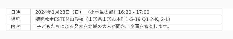 小学生から高校生までを対象に、山形県山形市と米沢市で開講している探究教室です。五感を刺激する感動的な体験から興味を広げていき、子供の興味をステップアップさせていくお手伝いをしております。