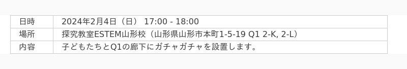 山形県米沢市・山形市の探究教室ESTEM(運営:株式会社山のむこう 代表取締役:大垣敬寛)では、2024年1月から3月まで「起業教室入門編」という授業を実施しています。この授業では子どもたち自身が商売について学びながらガチャガチャの企画運営をしてお金をかせぐというテーマで進めております。