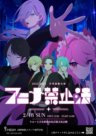 昨年に続き、2月18日(日)に学生の成果発表の場として、舞台「アニメ禁止法」を新潟市民芸術文化会館りゅーとぴあにて上演いたします。全学生が「演者」、「舞台スタッフ」、「映像スタッフ」に分かれ、それぞれの学びを活かして1つの作品制作を行い、エンターテインメントに関わる者としての自覚と経験を培うものとなっています。