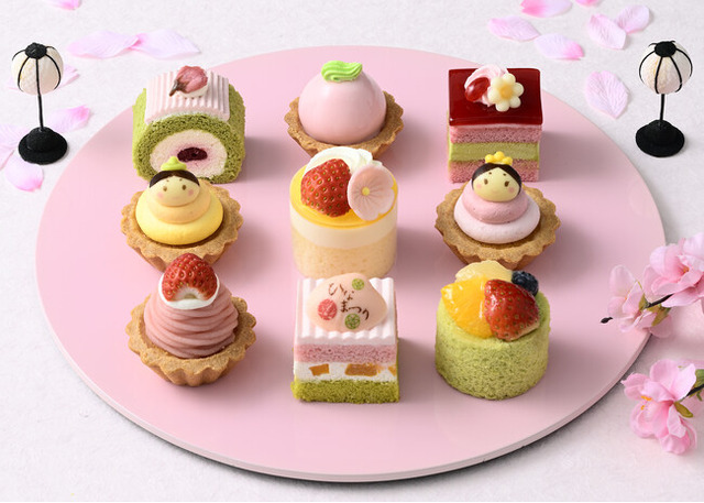 おだいりさま&おひなさまと、春色のプチケーキをアソートした「ひなパーティー(9個入)」や、縁起の良い”扇形”で、抹茶&苺風味スポンジとクリームを重ねて“ひなまつりカラー”に仕立てた「ひなおうぎ」など、お子様と一緒に選んでいただきたいラインアップ。