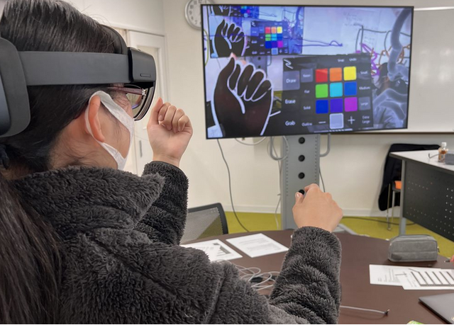 MRゴーグル(Microsoft HoloLens 2)を用いて学生全員が、手を用いて部屋の空間に花を咲かせたり、浮かぶ球状の物体を触ってその変化を観察したり、また空間に自由に絵を描く体験をしました。