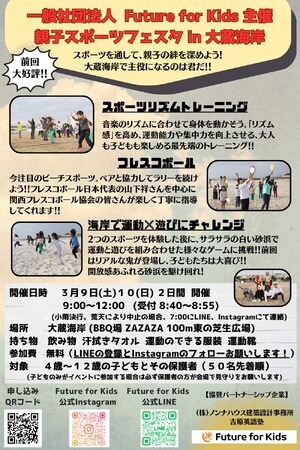 兵庫県明石市・神戸市を拠点に活動する「一般社団法人Future for Kids」が主催する親子向けイベントで、フレスコボール体験会が実施されることが決定しました。今回で二回目となるイベント開催で、前回は現日本代表選手の風味千賀子・宮山有紀選手(フレスコボール関西GVK所属)らが講師を担当。好評につき二回目の開催が実現しました。