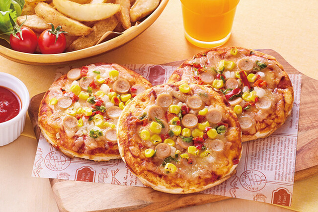 国産小麦を使用したクラストに、有機のピザソース・ナチュラルチーズ(国産の生乳使用)・ウインナー(国産豚肉使用・無塩せき)・国産ピーマン・国産玉ねぎ、国産コーンをトッピング。