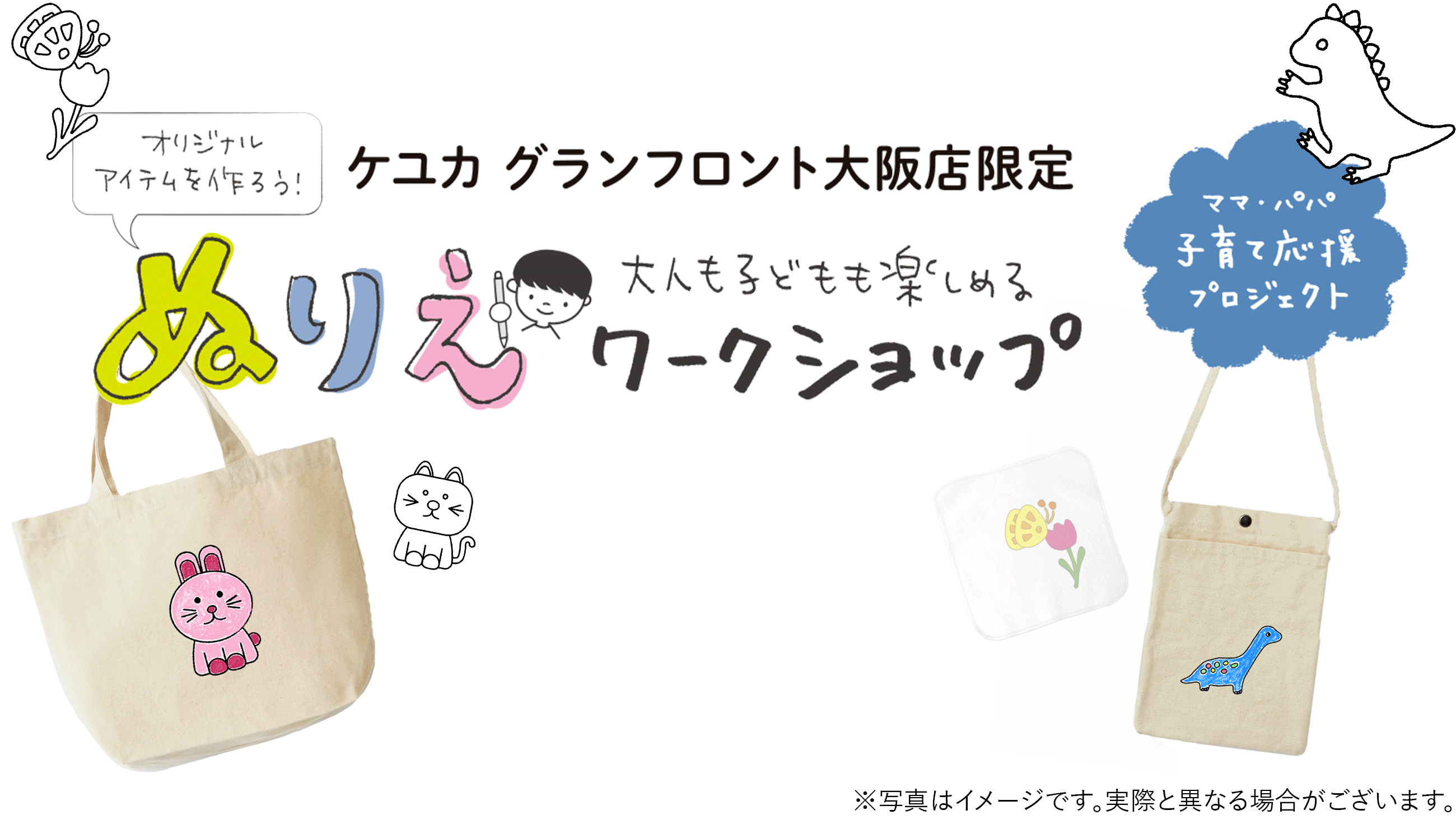 KEYUCAは、育児に奮闘するママやパパ、そしてその家族に寄り添い、育児を共に頑張りたいという思いから生まれた「ママ・パパ 子育て応援プロジェクト」の一環として、今回、KEYUCAグランフロント大阪店で親子向けのワークショップを開催します。この特別なワークショップでは、iPadを使ってKEYUCAのオリジナルイラストを塗り絵し、アイテムにプリントして自分だけのオリジナルアイテムを作成できます。