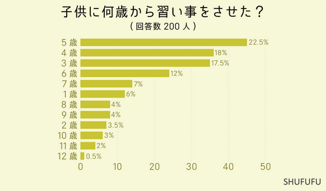 200人に子供に習わせて良かった習い事に関するアンケート調査を行った所、子供に習い事をさせたのは「5歳」からという回答が一番多かったです。