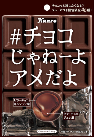 そんな「#チョコじゃねーよアメだよ」は、“バレンタインなのにチョコじゃなくてアメ!? バレンタインに渡せるチョコっとプレゼント”がコンセプトの商品です。「長時間、口に飴を入れていることがストレス」という学生の意見をもとに、ひと粒で飽きてしまわないよう、センターに濃厚なビターチョコジュレを入れ2層構造にするこ