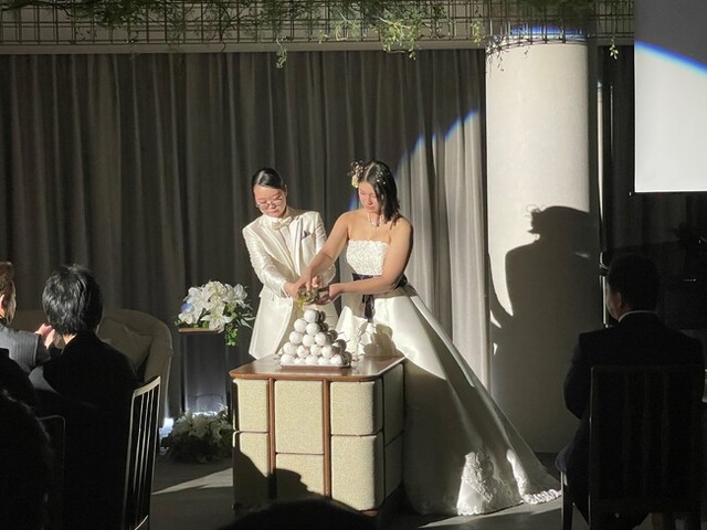 1つ目のコースは、「インバウンド」をターゲットにした、京都の「ブライダルツーリズム」の向上を目的とするプランを提案しました。京扇子と蓮の花を使った「オリジナルダズンローズセレモニー」やゲストの名前が書かれた京判子を使用した「結婚証明書」、ウエディングケーキ入刀に代わる演出として「団子セレモニー」などを発表しました。